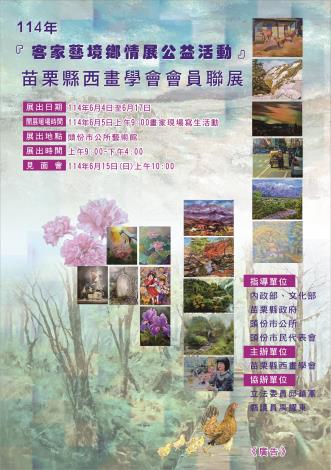 苗栗縣西畫學會於114年6月4日(三)至6月17日(二)每日上午9時至下午4時於頭份市公所藝術館舉辦「114年客家藝境鄉情展公益活動」展覽,歡迎鄉親蒞臨觀賞!