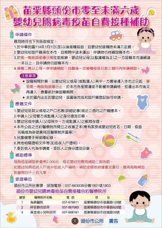 本所訂定「苗栗縣頭份市零至未滿六歲嬰幼兒腸病毒疫苗自費接種補助辦法」,自114年1月1日生效。